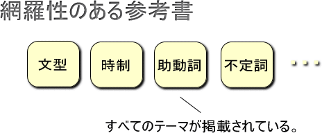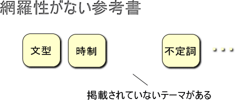 網羅性がない参考書とは、「あれ?英語には、××というテーマがあったよな?この参考書には掲載されていないよ〜」というところが多くなります。